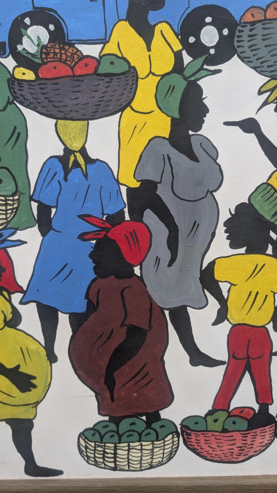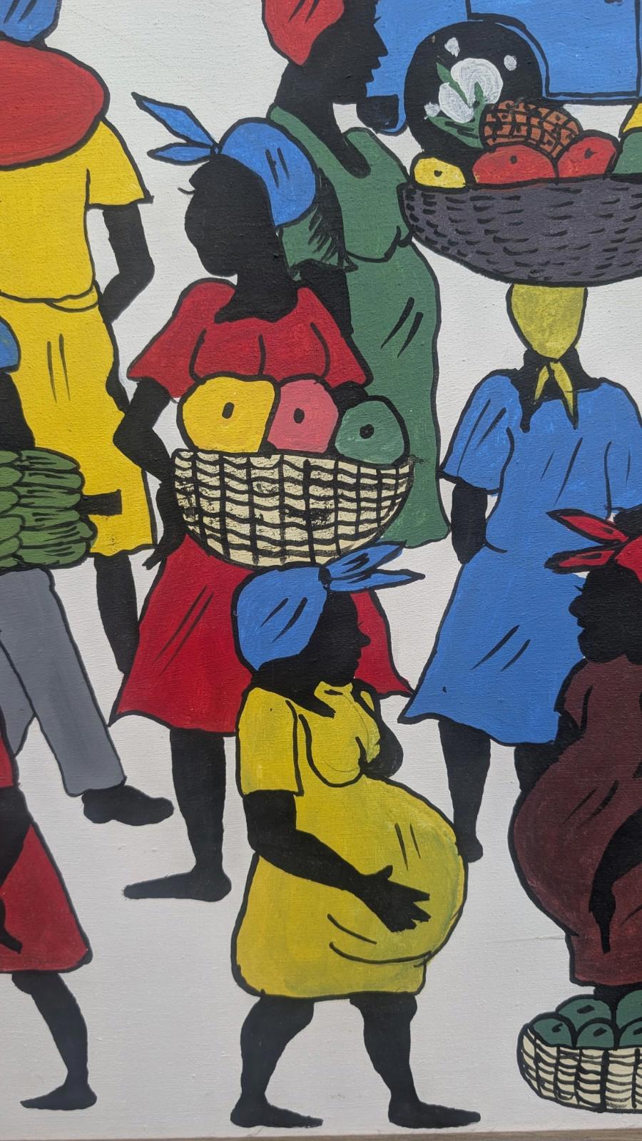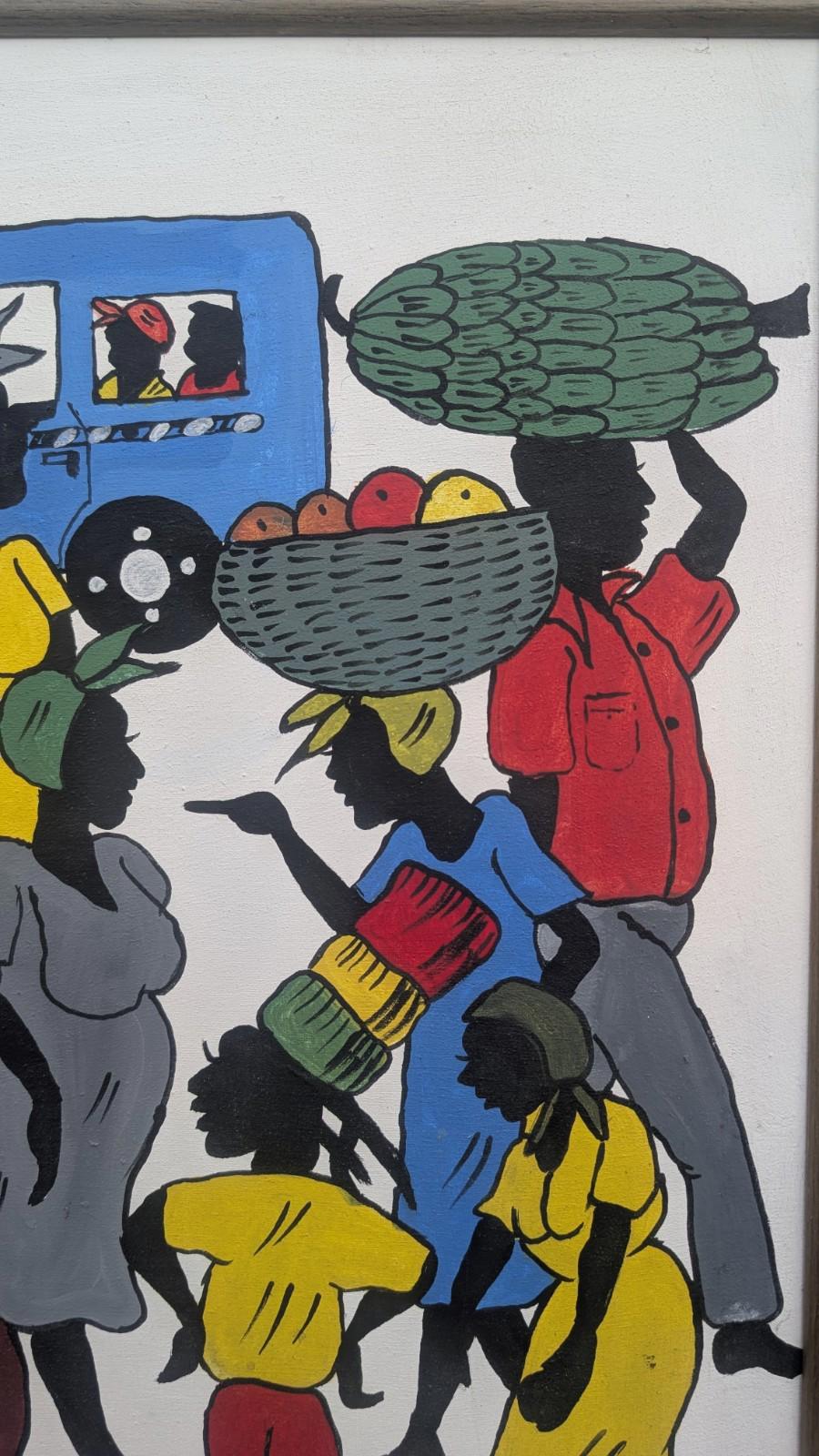 This superb colourful vintage oil painting on canvas by Jeff Jamaica depicts a scene from the West Indies, showcasing vibrant multi-coloured figures in a realistic style. The painting is signed by the artist and measures medium size, with a width of 31 inches and a height of 23.5 inches. Created using oil painting techniques, this original piece is a unique and eye-catching addition to any art collection, reflecting the rich cultural heritage of Jamaica.