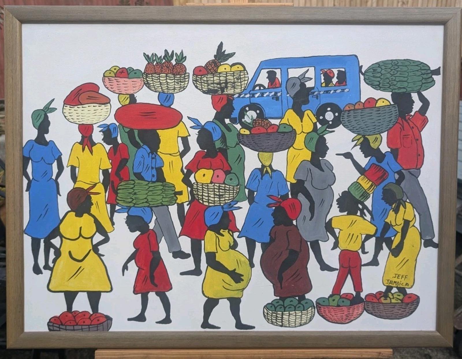SUPERB COLOURFUL VINTAGE SIGNED OIL PAINTING ON CANVAS JEFF JAMAICA WEST INDIES
